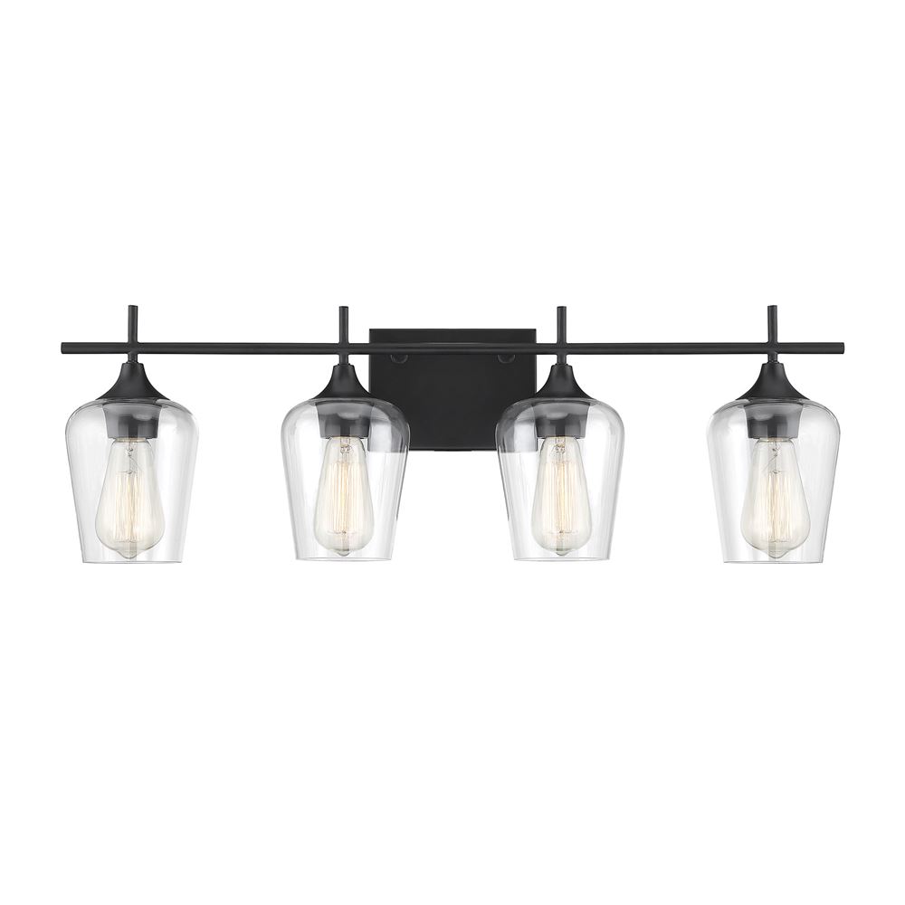The Octave 4-light bath bar from Savoy House has understated elegance. It features large curved shades of clear glass, minimal detailing and a matte black finish. It may be mounted as either uplight or downlight. Bath bar lights are a classic choice for illuminating vanity mirrors in bathrooms big and small.