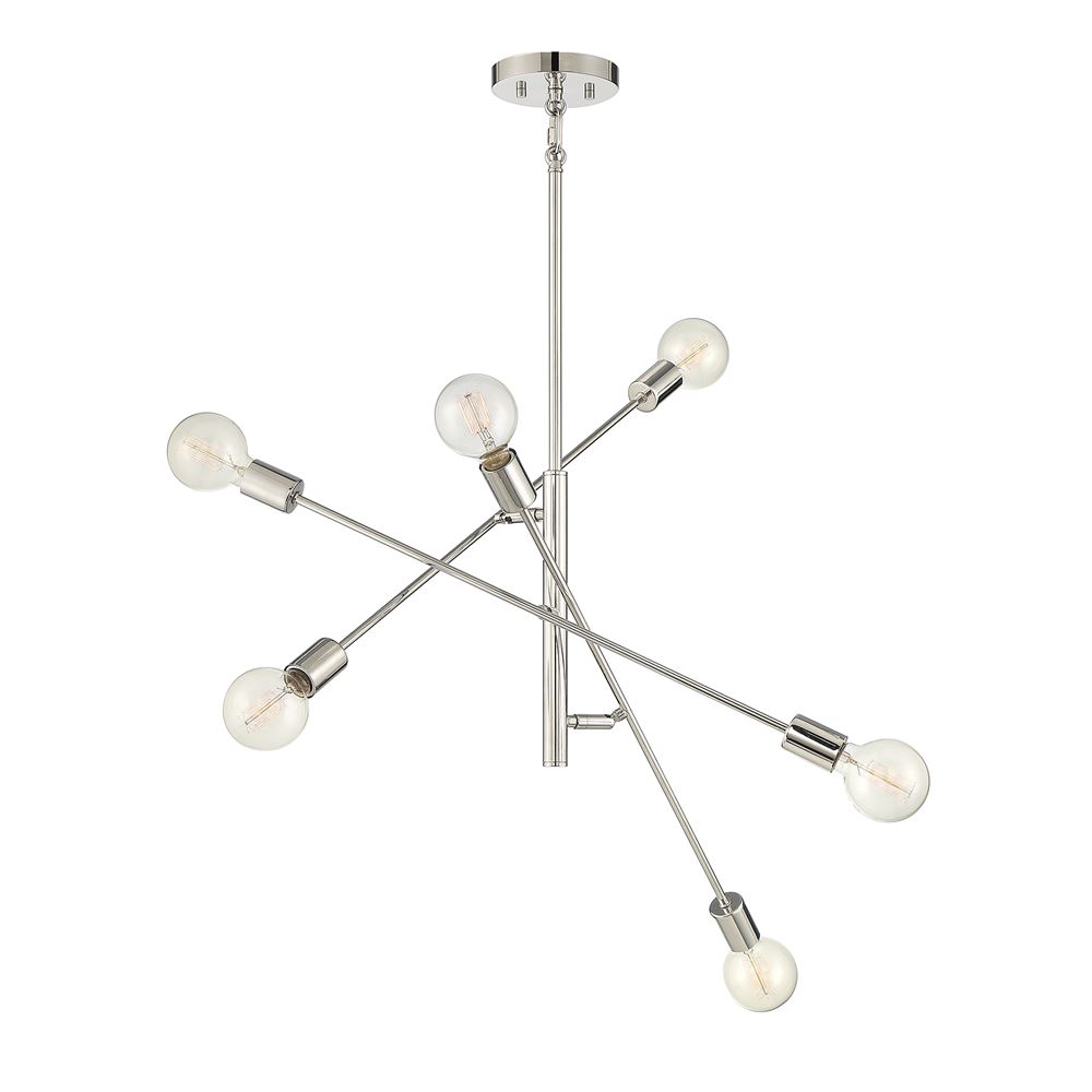This Meridian 6-light chandelier features adjustable arms, allowing you to create your own lighting look and change it up on the fly. Its simple and streamlined design makes it a smart choice for brightening up rooms of contemporary, modern or industrial decor styles. Finished in polished nickel. This chandelier is 12 inches in height and 26 inches in width, plus it includes four 12-inch downrods and one 6-inch downrod to let you adjust the height for a maximum of66 inches.