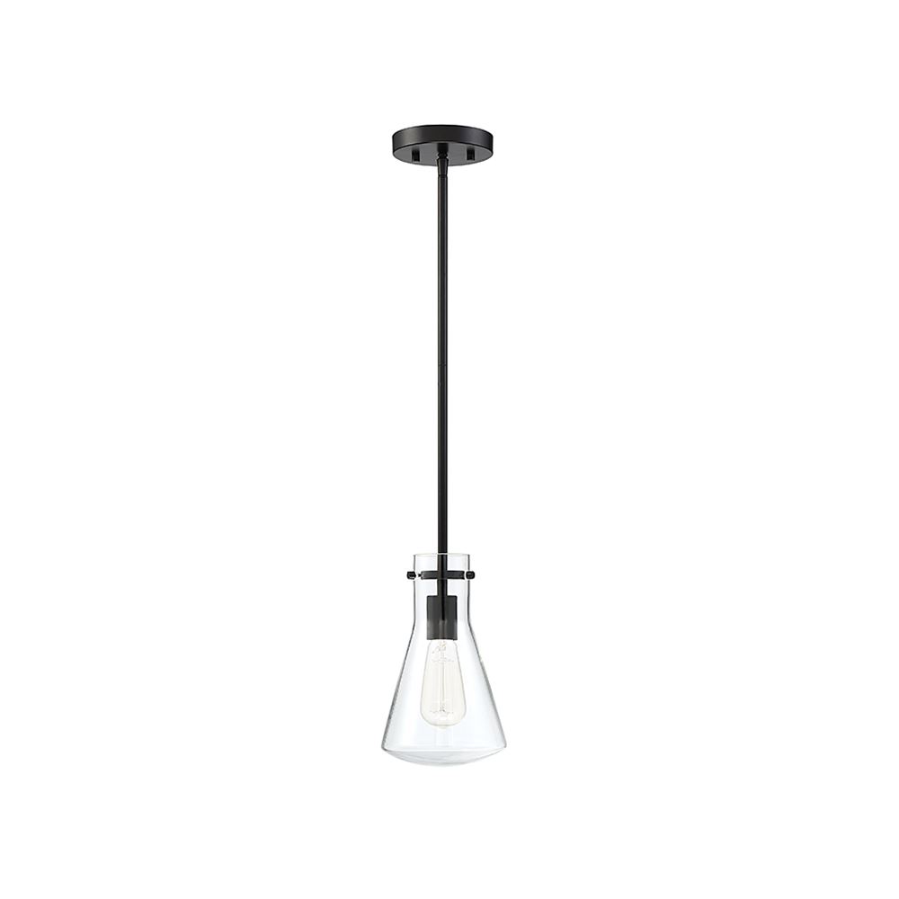 Use this 1-light pendant to change up your lighting style! Features a curving shade of clear glass and a matte black finish.