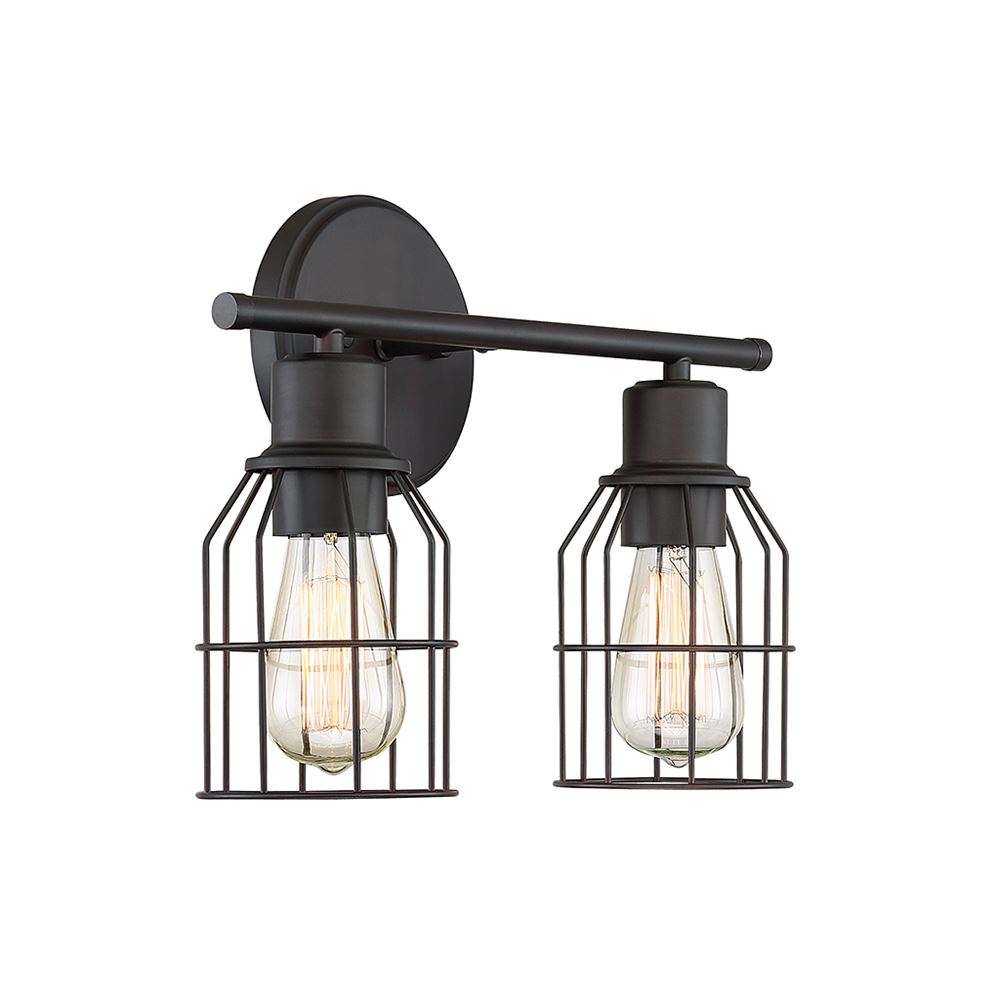 This industrial-style 2-light bath bar offers thin wire cage shades over exposed light sources and an Oil Rubbed Bronze finish.