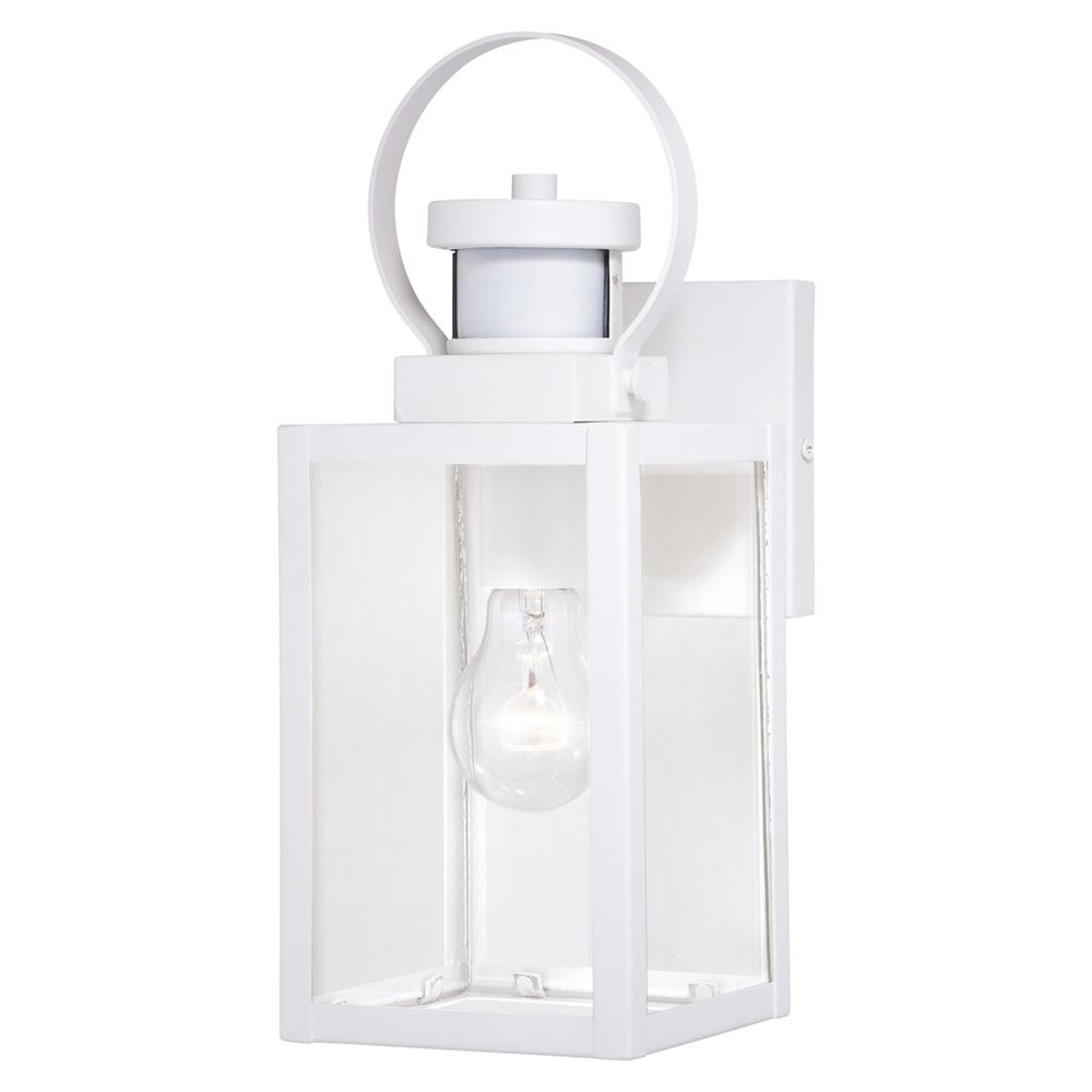 The Medinah is an example of classic minimalist elegance. Large panes of clear glass are framed by textured white frames. The top looped lantern handle adds an additional focal point to the overall design. This outdoor wall light is ideal for your covered porch, entryway, garage, or any other area of your home. This fixture combines a motion sensor, dusk to dawn photocell, and timer all in one decorative light. Our easy access quick-set control puts all these features at your fingertips.