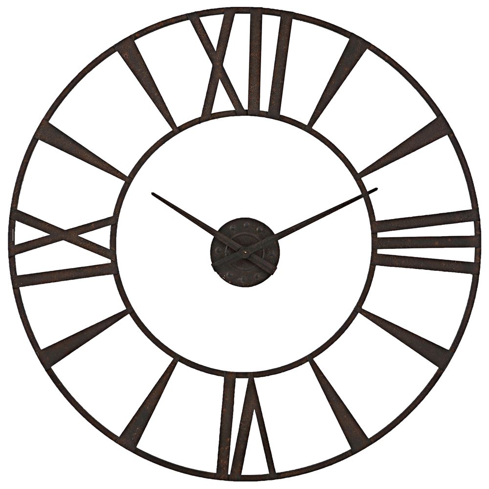 Oversized wall clock features a solid iron framework finished in a rustic, textured rust bronze with coordinating floating center dial. Quartz movement ensures accurate timekeeping. Requires one "AA" battery.