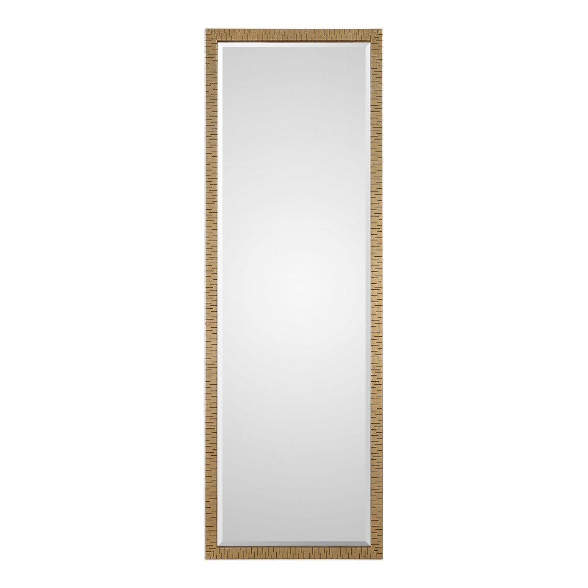 Thick Iron Frame Featuring Alternating Laser Cut Grooves, Finished In A Lightly Antiqued, Metallic Gold Leaf. Mirror Has A Generous 1 1/4" Bevel. May Be Hung Horizontal Or Vertical.