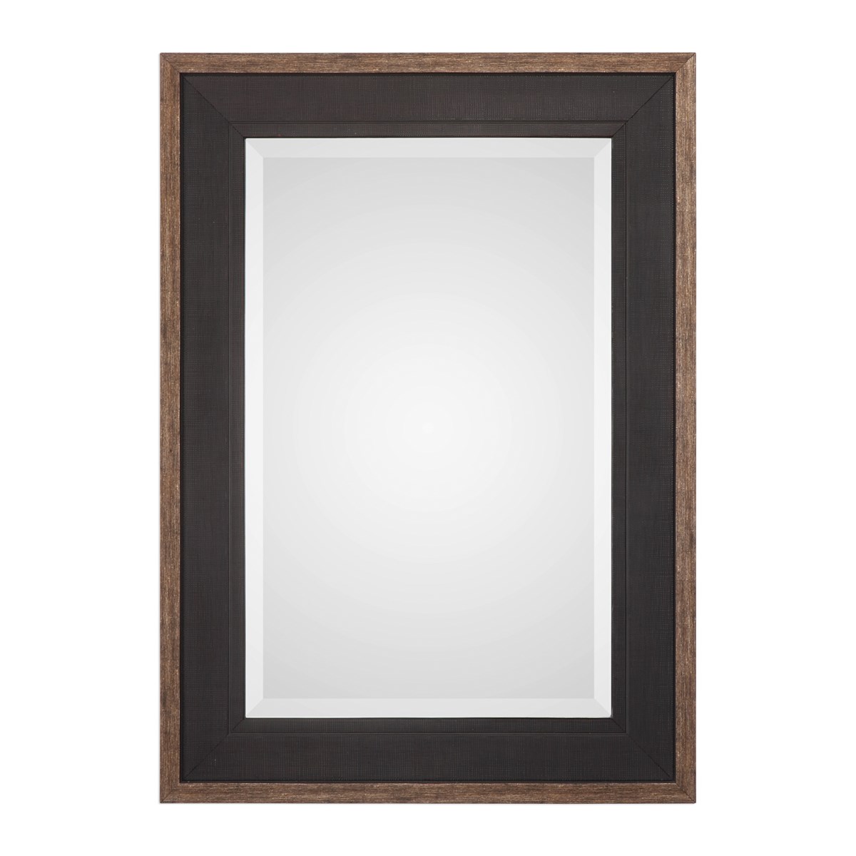 This Solid Pine Frame Has A Mesh Texture Surface Finished In A Rustic Black, Accented With A Distressed Aged Bronze Outer Edge. Mirror Features A Generous 1 1/4" Bevel. May Be Hung Horizontal Or Vertical.