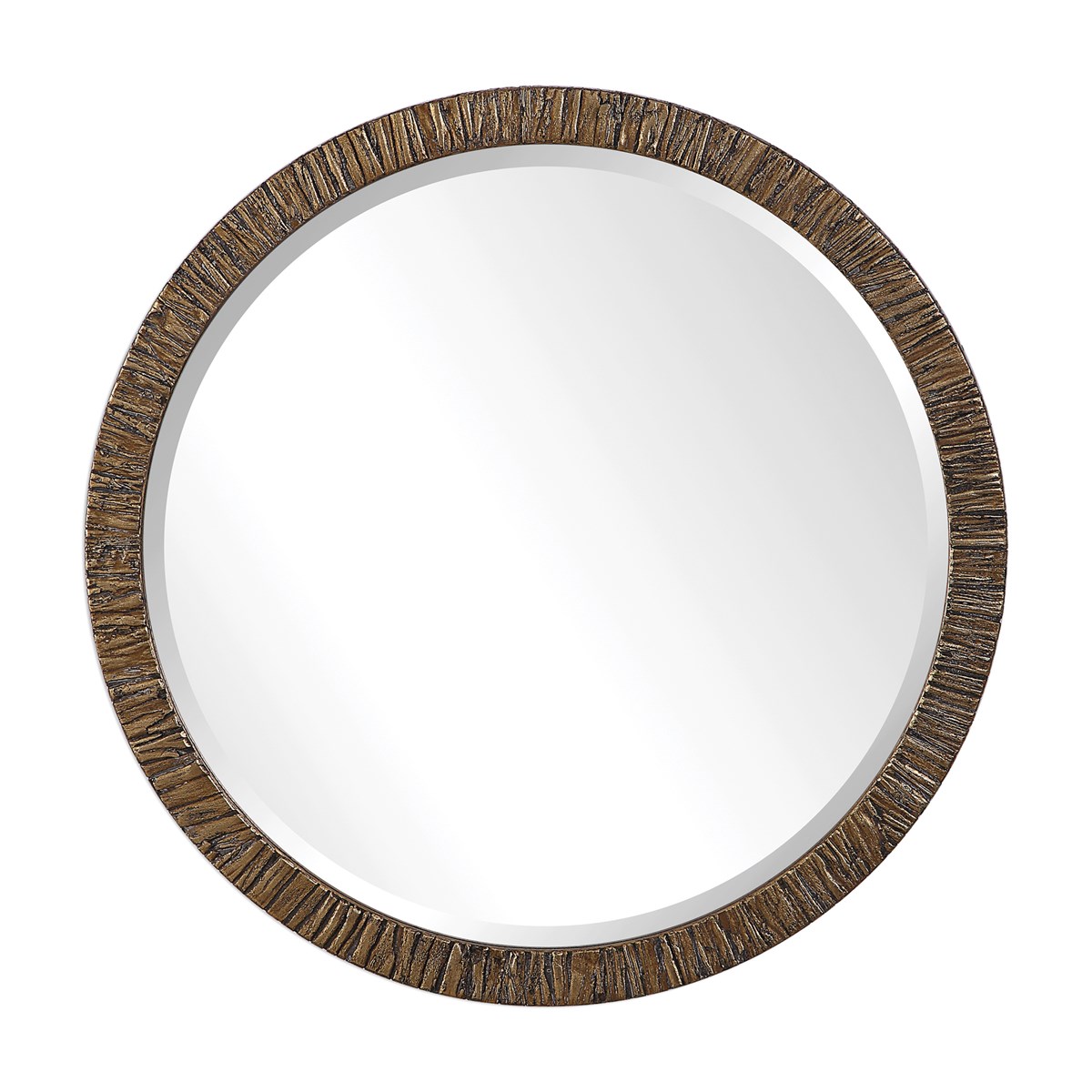 This Classic Round Mirror Showcases A Modern Style That Is Easy To Place In Any Design. The Solid Wood Frame Is Covered In A Layer Of Preserved Natural Tree Bark, With Noticeable Deep Texture. Each Piece Is Finished In A Heavily Distressed Antiqued Metallic Gold Leaf. The Mirror Is Surrounded By A Considerable 1 1/4" Bevel.