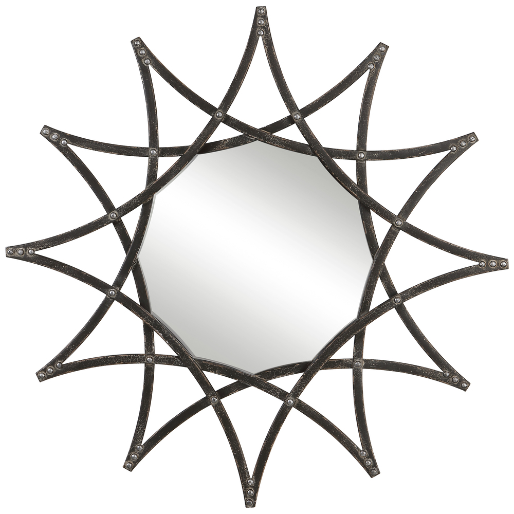 Handcrafted From Forged Iron, This Mirror Showcases A Star-shaped Frame Finished In An Aged Crackled Charcoal With A Light Gray Glaze And Antiqued Silver Rivet Like Accents.