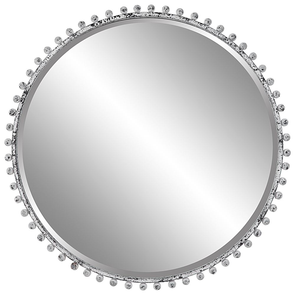 Petite Iron Spheres Line The Outer Edge Of This Round Frame, Finished In A Heavily Distressed Aged White With Rustic Black Undertones. Mirror Features A Generous 1 1/4" Bevel.