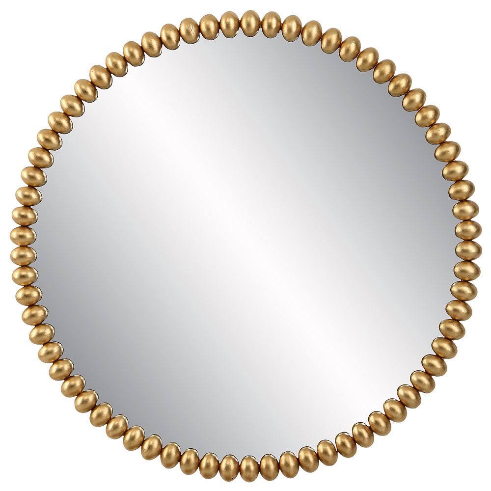 This round iron mirror features a sophisticated beaded profile in a rich antiqued gold leaf finish.