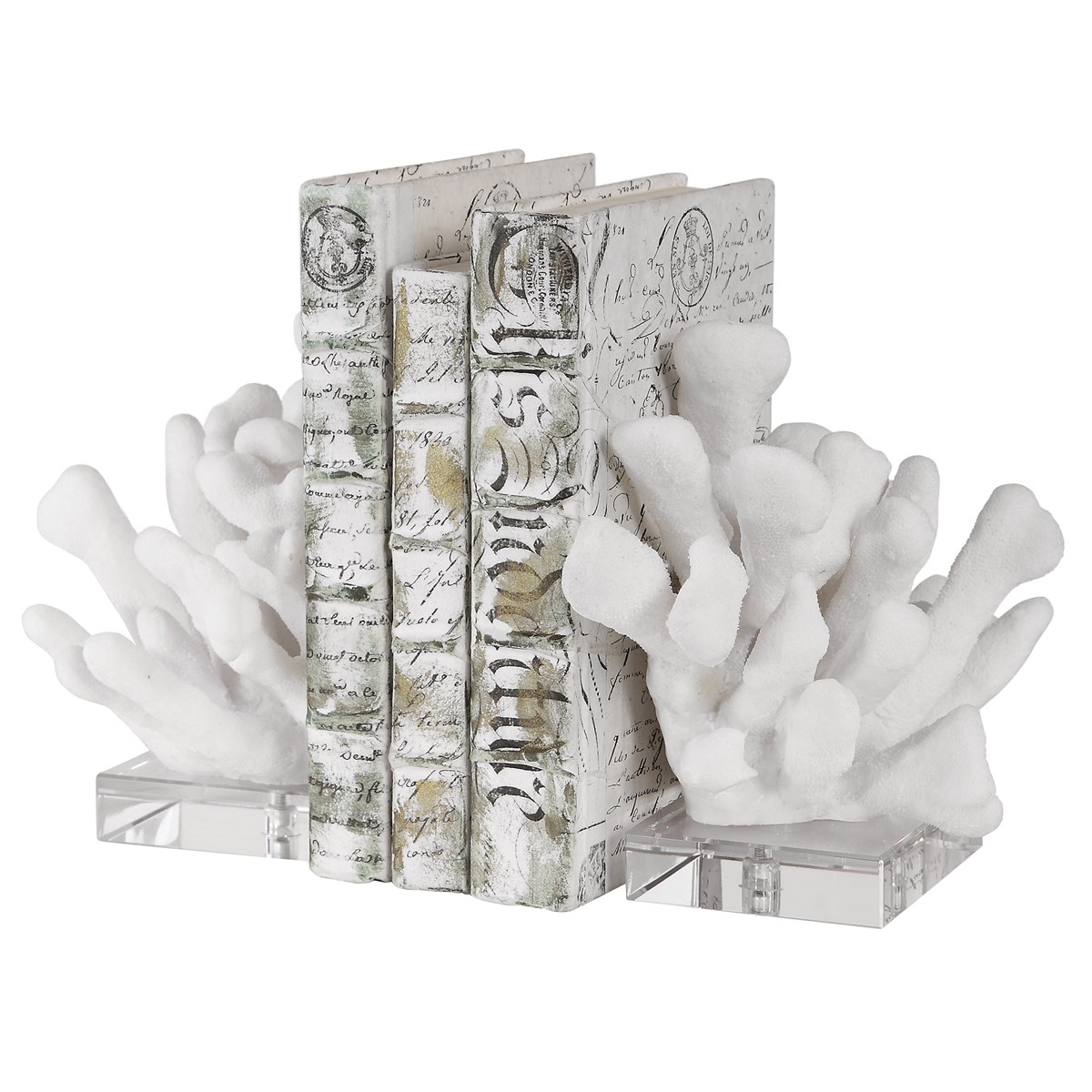 Set Of Two Bookends Featuring Textured Faux White Coral On Crystal Bases.