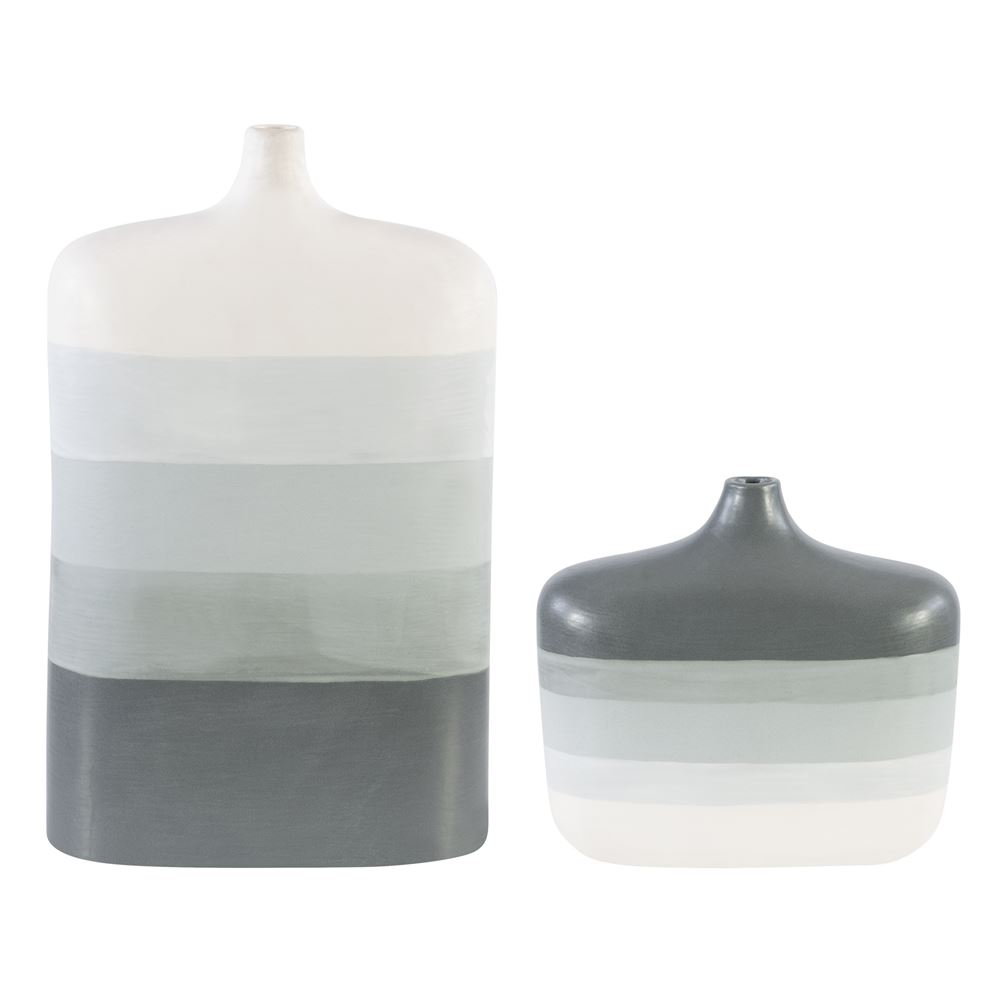 Set Of Two Earthenware Vases Are Finished In A Striped Gray Ombre Glaze.