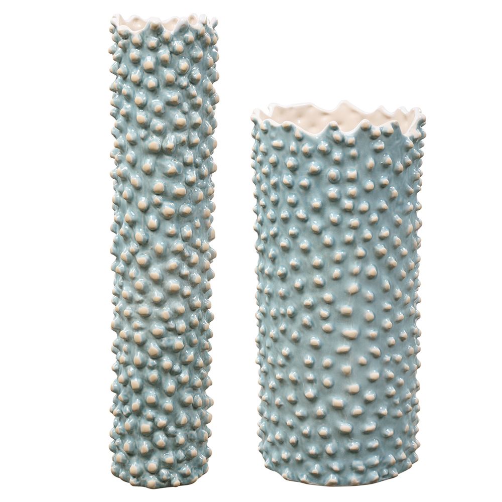 Set Of Two, Aqua Ceramic Vases With Heavy Exterior Texture And An Ivory Interior Glaze.
