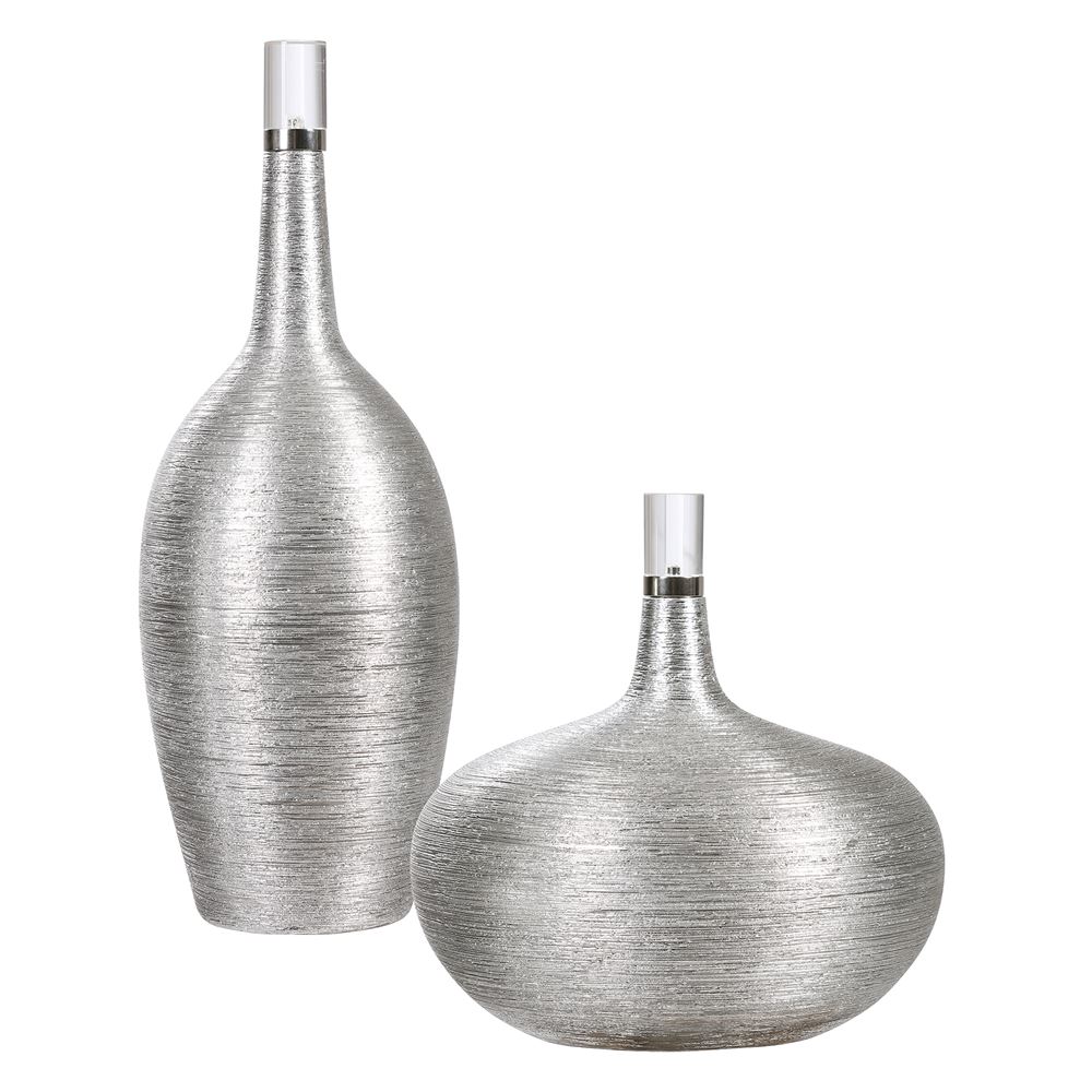Set Of Two Ceramic Bottles Showcase A Subtle Ribbed Texture, Finished In Bright Silver Leaf With Crystal And Brushed Nickel Accents.