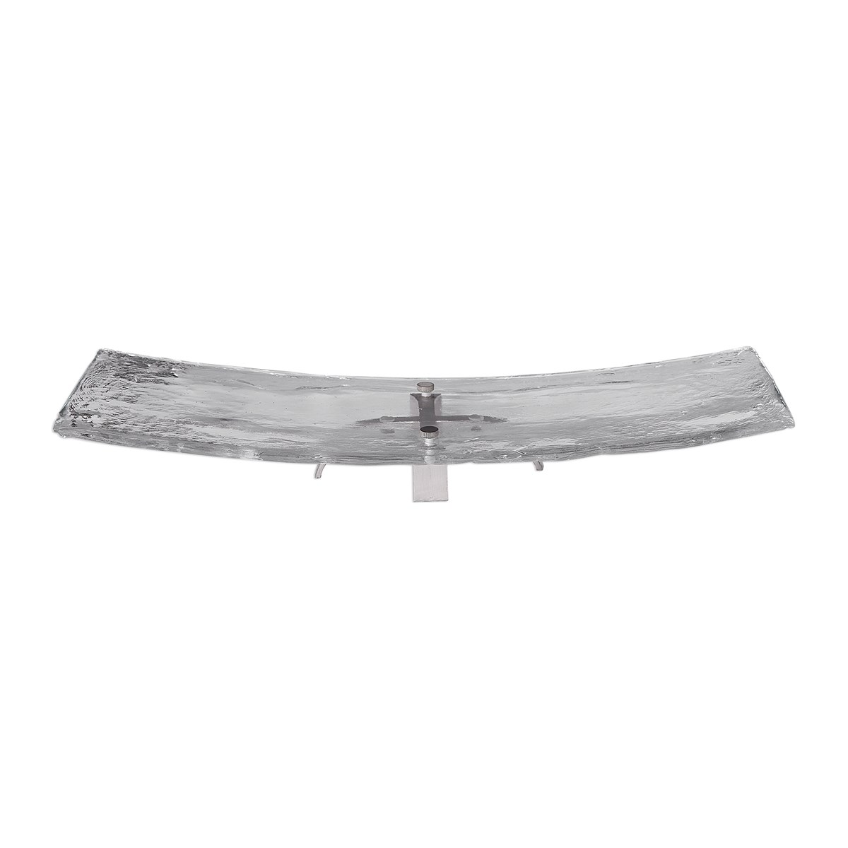 Clear Art Glass Tray Features A Slight Curve To The Glass And Is Displayed On A Brushed Nickel, Open Arch Base.