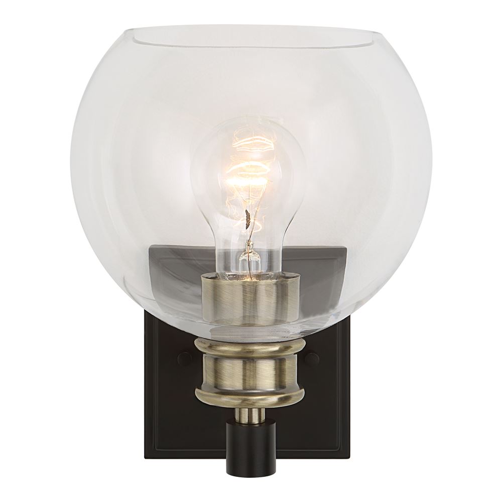 Timeless lines make this 1 lt. Sconce an understated classic. Finished in a combination of matte black & plated antique brass then topped with sparkling clear round glass shade. With 1-60 watt max, Edison socket.