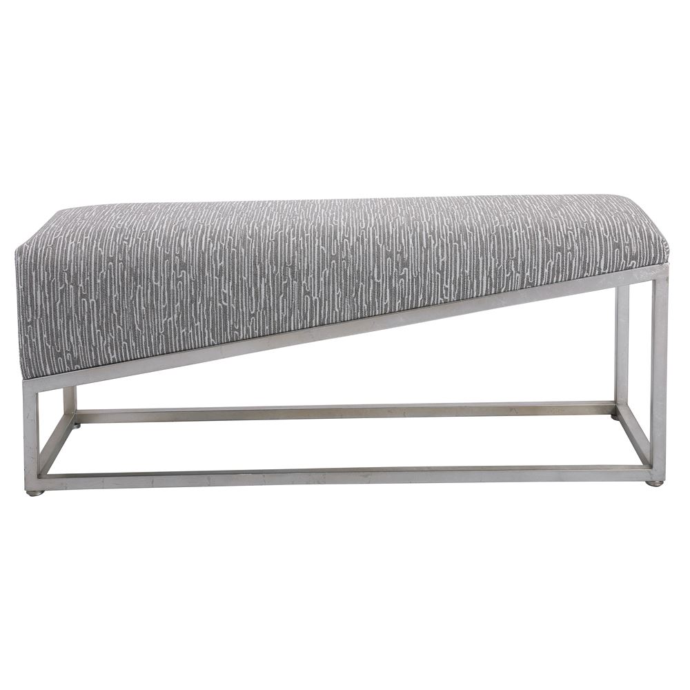 Showcasing Sleek Angular Lines, This Bench Is The Perfect Modern Accent. The Forged Iron Base Is Finished In Brushed Silver Leaf And Is Accented By A Medium Gray And White Geometric Fabric.