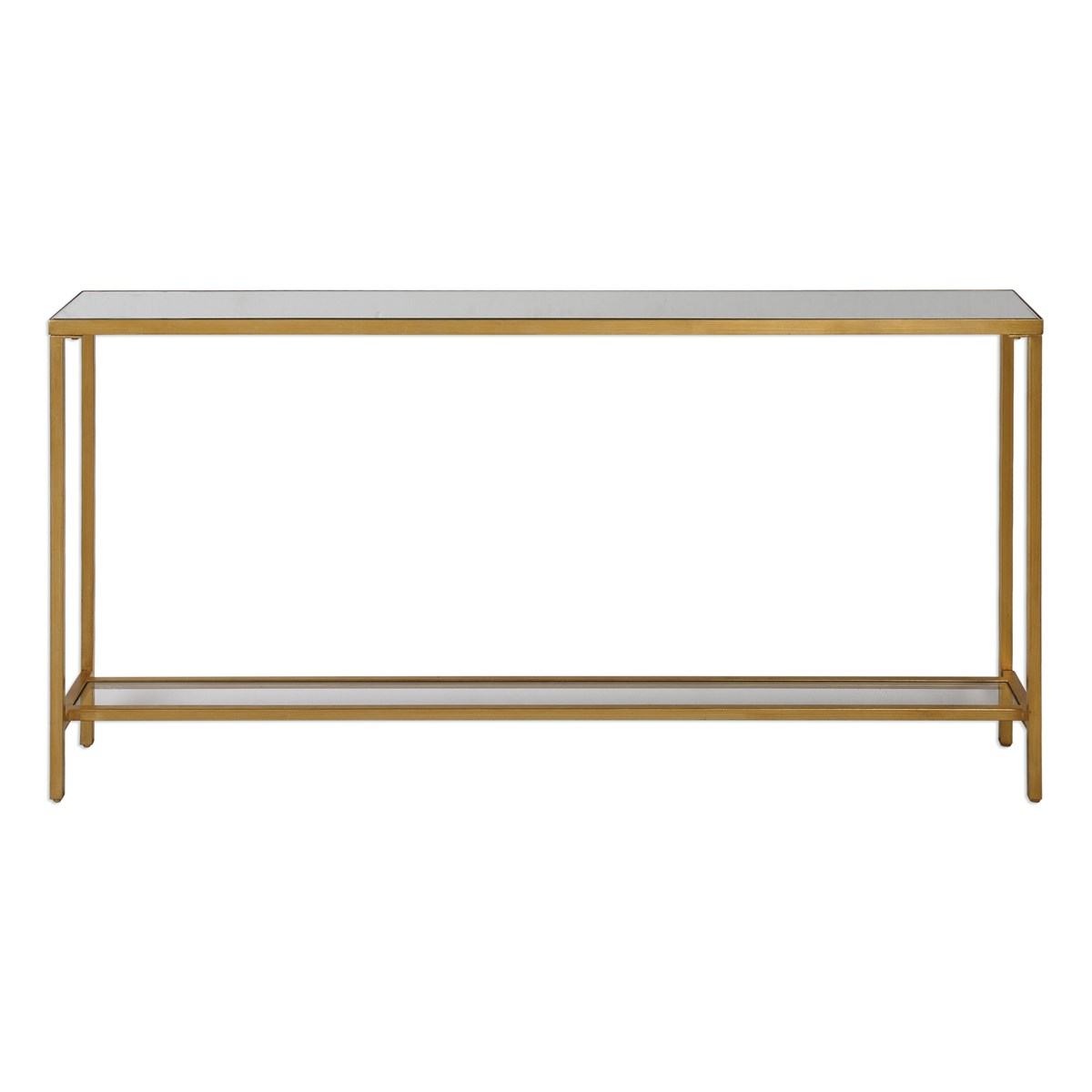 Classic And Minimalistic, This Narrow Console Table In Iron Is Finished With Lightly Antiqued Gold Leaf, Inset With Mirrored Top, And Gallery Shelf In Clear Glass.