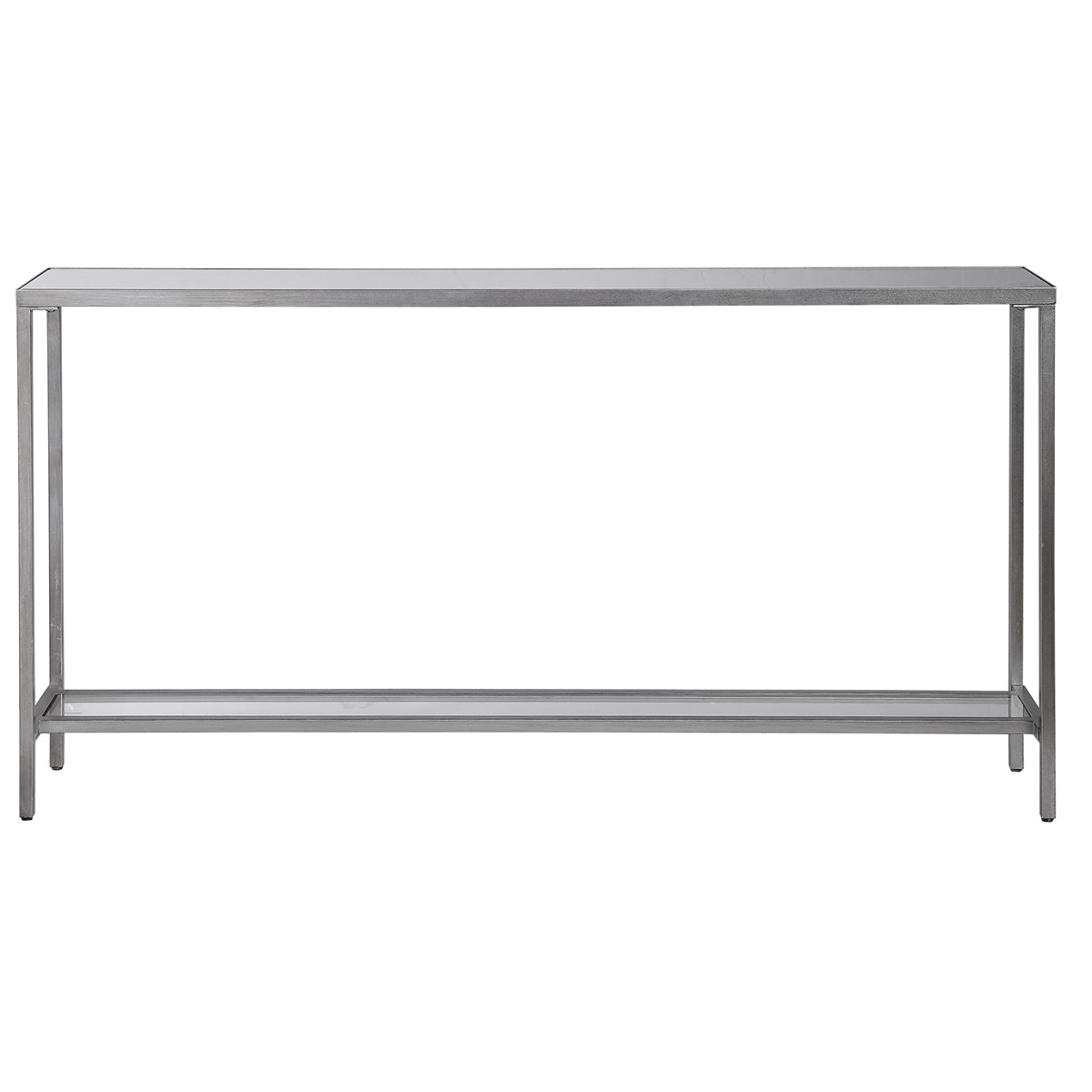 Classic And Minimalistic, This Narrow Iron Console Table Is Finished With Lightly Antiqued Silver Leaf, Inset With A Mirrored Top, And Gallery Shelf In Clear Glass.