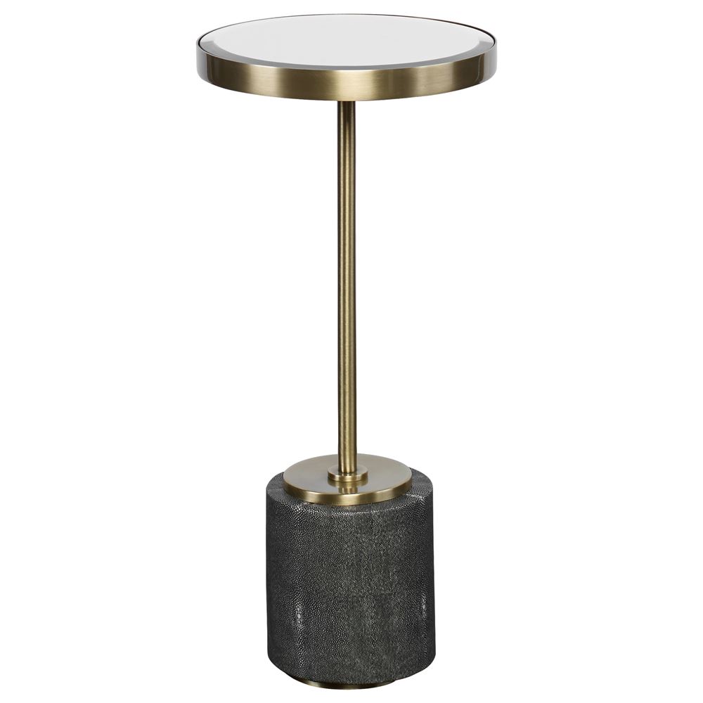 Stylish And Sophisticated, This Round Accent Table Features A Gray Faux Shagreen Base Paired With An Iron Support In Rich Brushed Brass And A Beveled Mirror Top.