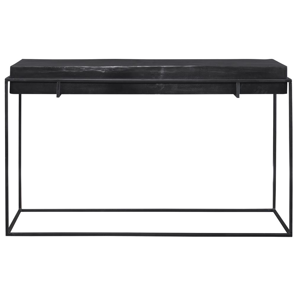 With Modern Minimalist Styling, This Console Table Features A Thick Cast Aluminum Top With Natural Texturing Finished In A Dark Oxidized Black, Resting In A Coordinating Aged Black Iron Base.