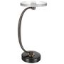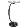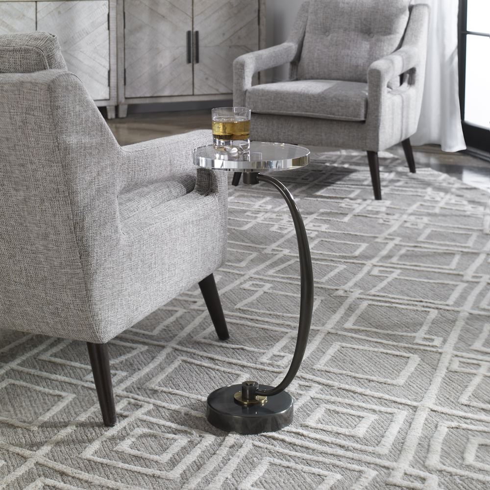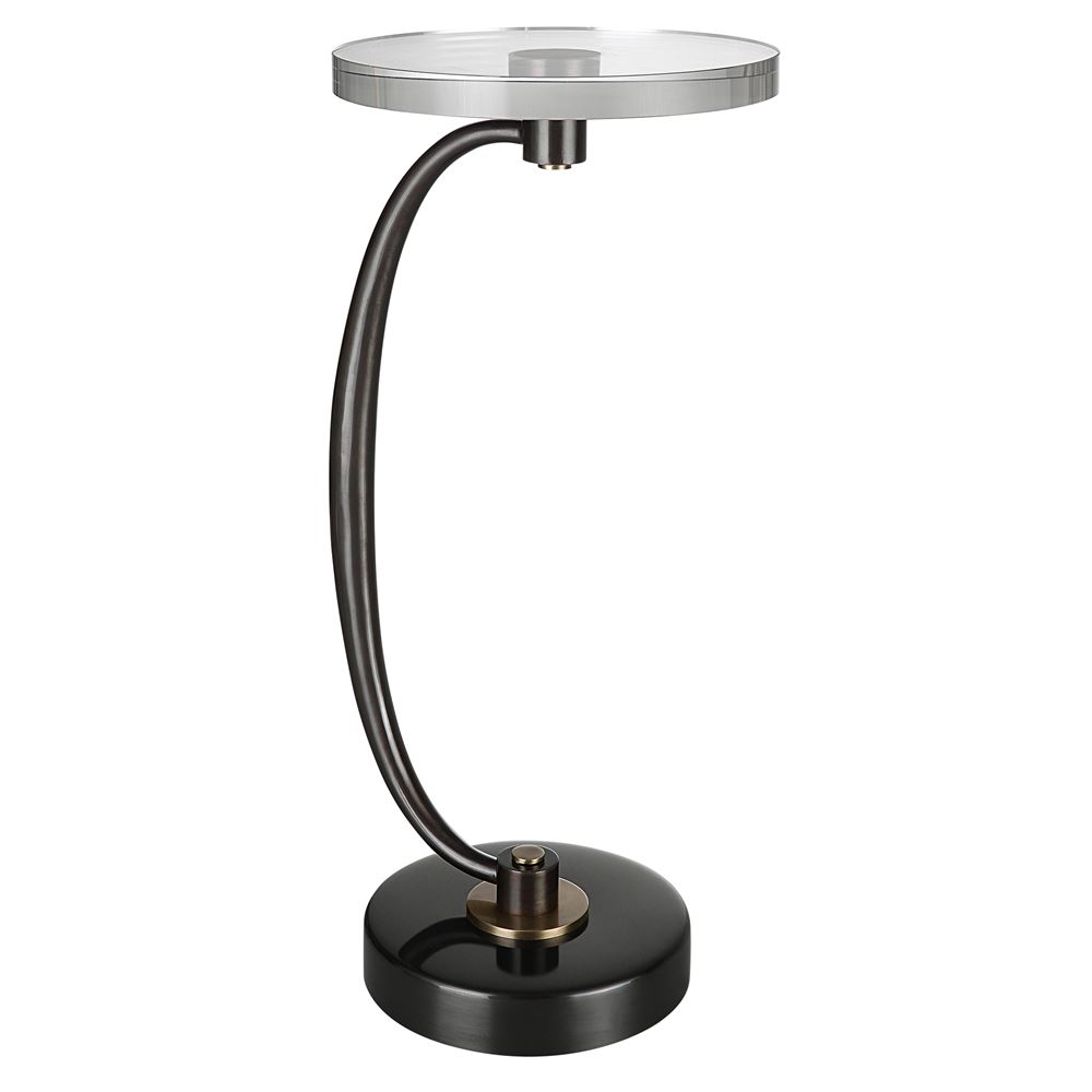 Minimal Yet Sophisticated, The Waveney Drink Table Displays A Sleek Curved Iron Base In Dark Bronze With Antique Brass Plated Accents And A Thick Crystal Top.