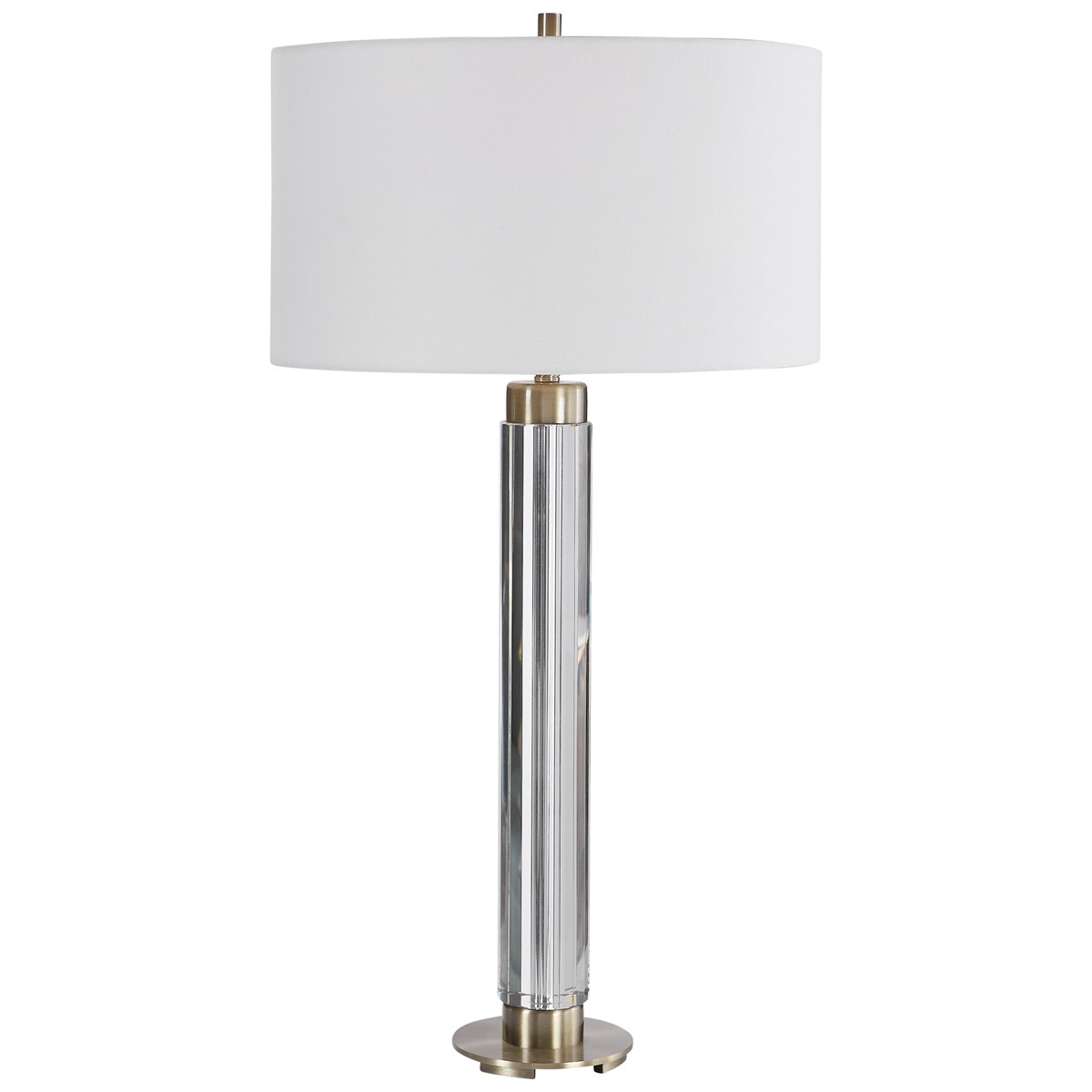 Contemporary In Style, This Cut Crystal Table Lamp Showcases Clean Lines, Accented With Lightly Antiqued Brass Plated Details. The Round Hardback Drum Shade Is A White Linen Fabric.