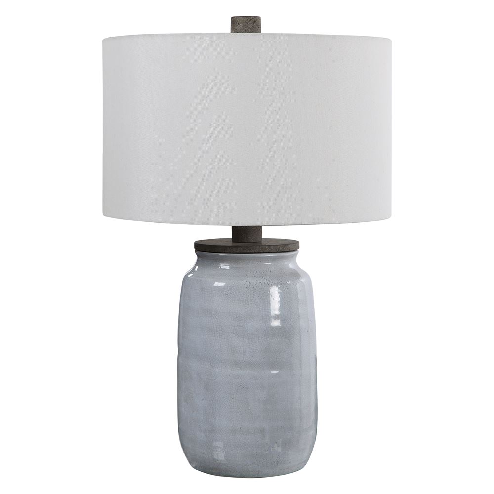 This Ceramic Table Lamp Is Finished In A Light Blue Crackle Glaze, Accented With Aged Charcoal Stained Concrete Details. The Round Hardback Drum Shade Is A White Linen Fabric With Light Slubbing. Due To The Nature Of Fired Glazes On Ceramic Lamps, Finishes Will Vary Slightly.
