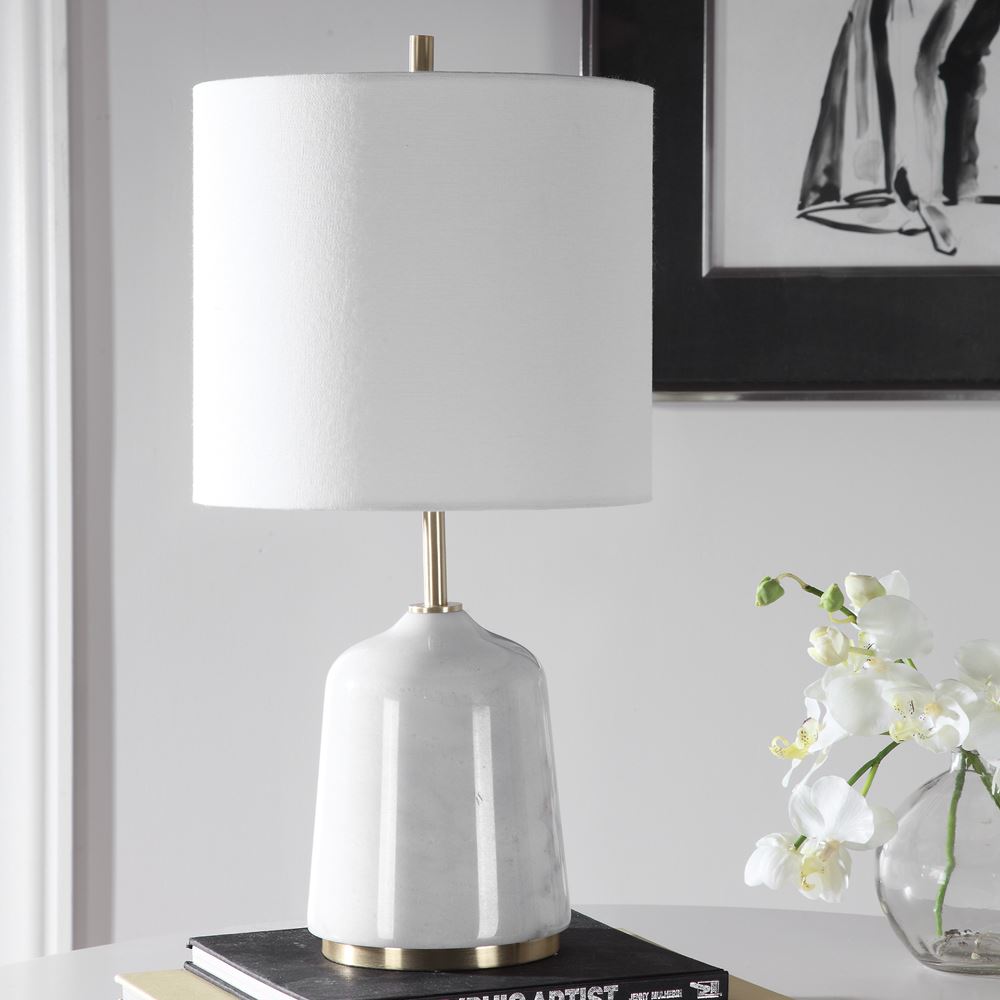 This Elegant Table Lamp Showcases A Thick White Marble Base With With Subtle Gray Veining, Accented With Brushed Light Brass Plated Details. The Lamp Is Paired With A White Linen Fabric, Round Drum Shade.