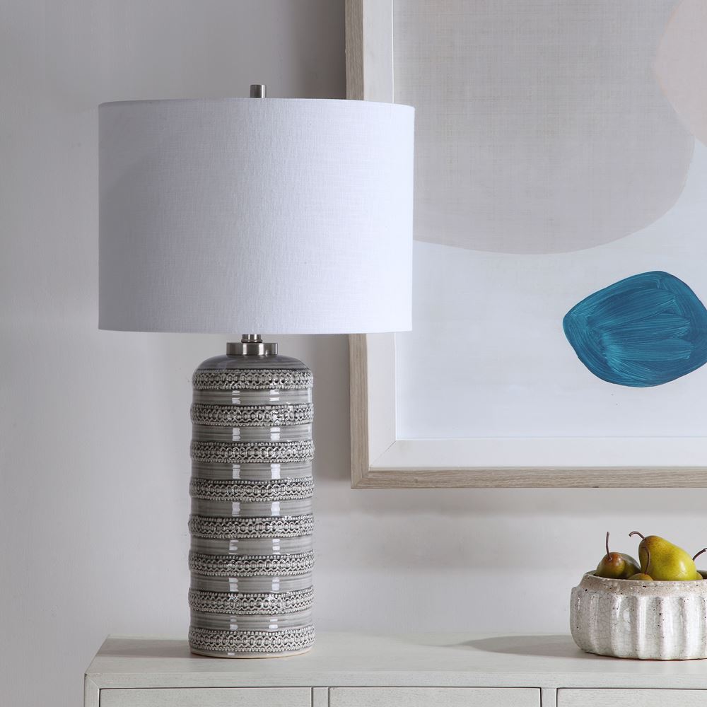 This Traditional Ceramic Table Lamp Has An Elegant, Overlaid Lace Design With A Delicate Light Gray Glaze, Accented With Brushed Nickel Plated Details. The Piece Is Paired With A White Linen Fabric Drum Shade With Natural Slubbing.
