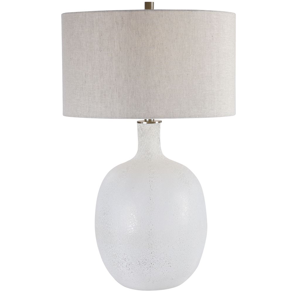 Beautiful And Functional, This Table Lamp Features A Glass Base Finished In A Heavily Textured, Mottled Aged White, Accented By Brushed Nickel Plated Details. The Round Hardback Drum Shade Is A Light Oatmeal Linen Fabric With Natural Slubbing.