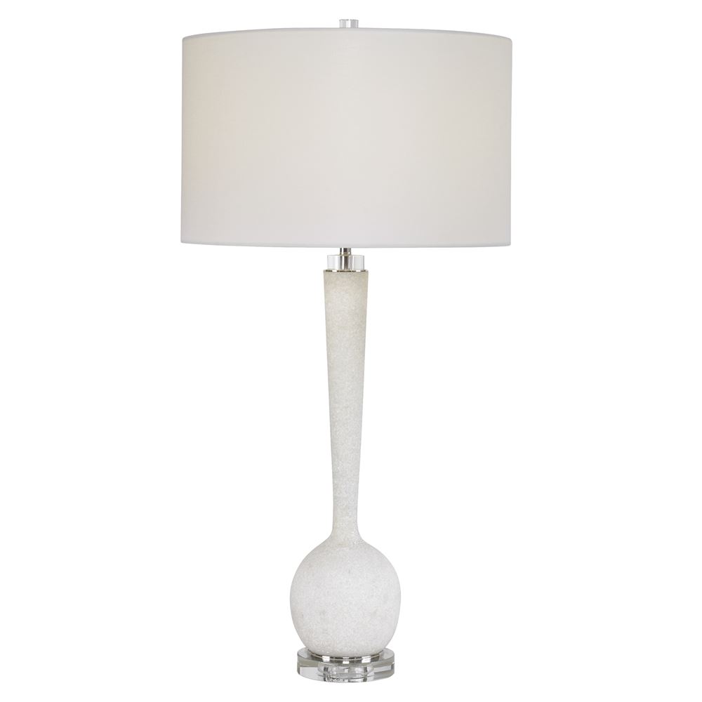 This Elegant Table Lamp Is Executed In A Rich Looking Material Made Of Granulated White Marble That Accurately Replicates The Look Of Thassos Marble, Accented By Thick Crystal Details. A White Hardback Drum Shade Completes The Lamp.