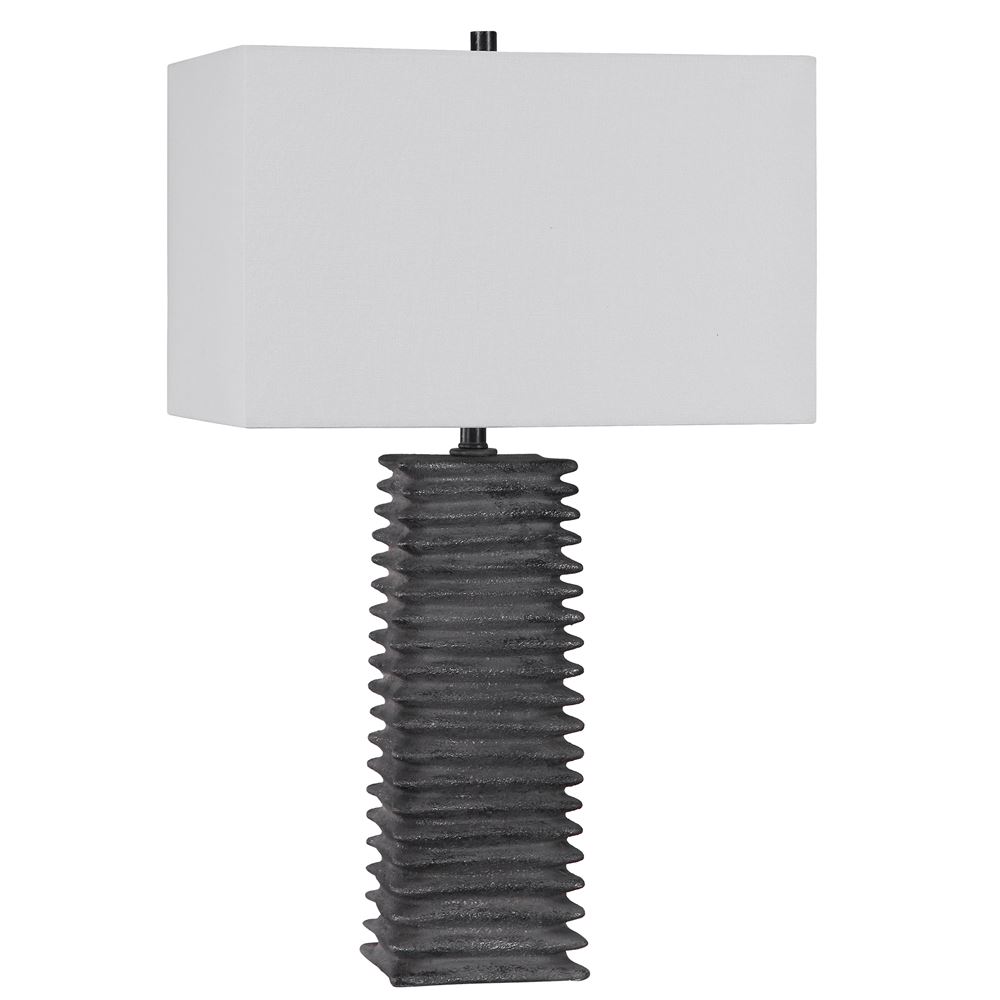 This Ceramic Table Lamp Features A Deep Ribbed Texture With A Subtle Organic Shape Finished In A Metallic Charcoal Glaze, Accented With Matching Metal Details. The Rectangle Hardback Shade Is A White Linen Fabric.