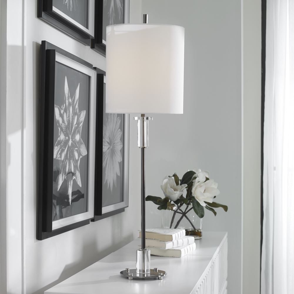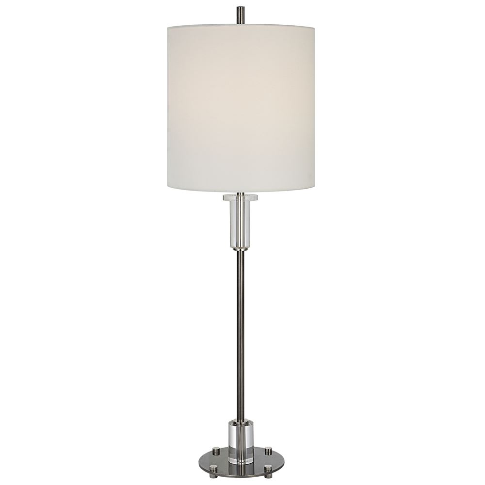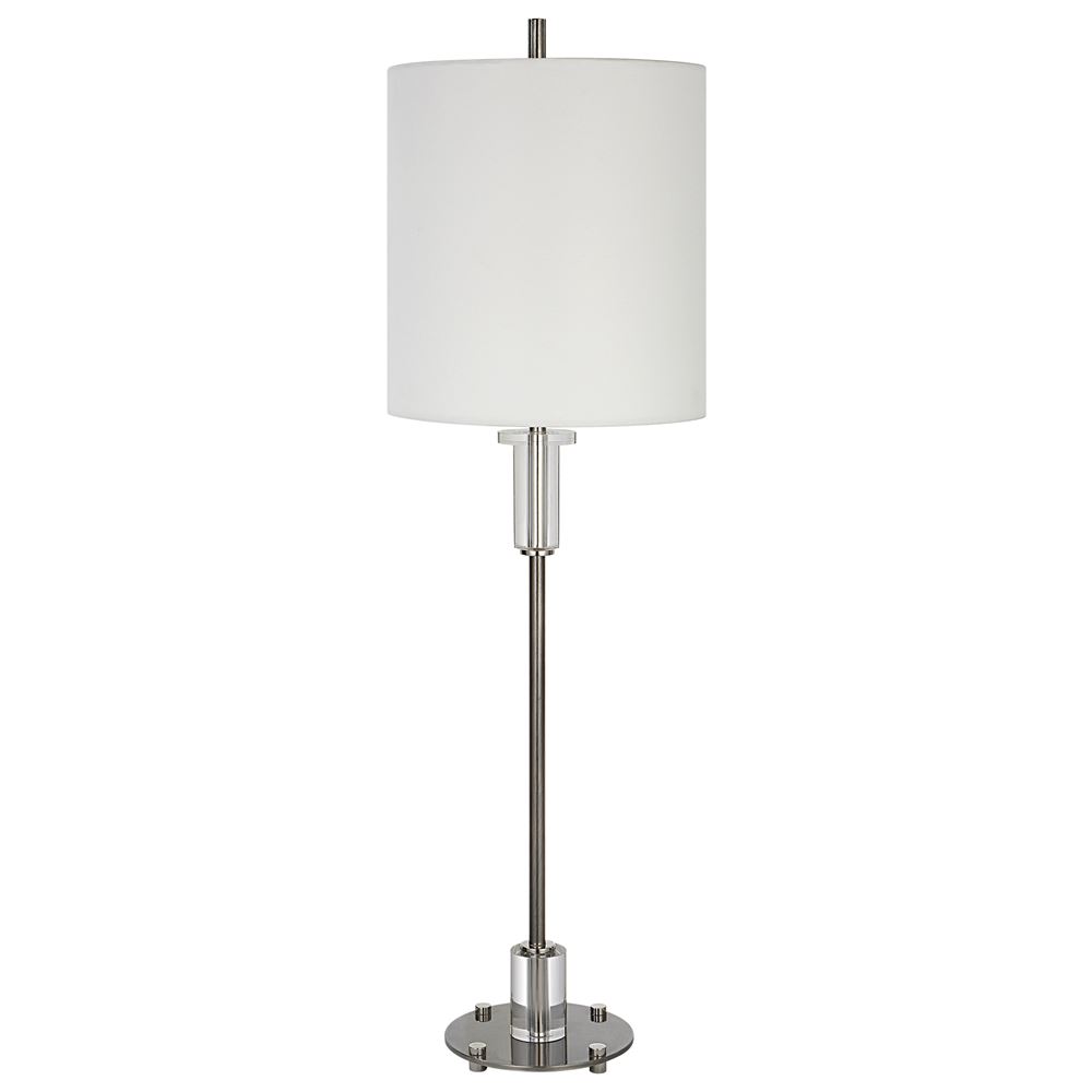 This Steel Buffet Lamp Features Clean, Simple Detailing With A Polished Nickel Base And Unique Foot, Adorned With Thick Crystal Accents. The Round Hardback Shade Is Wrapped In White Linen Fabric.