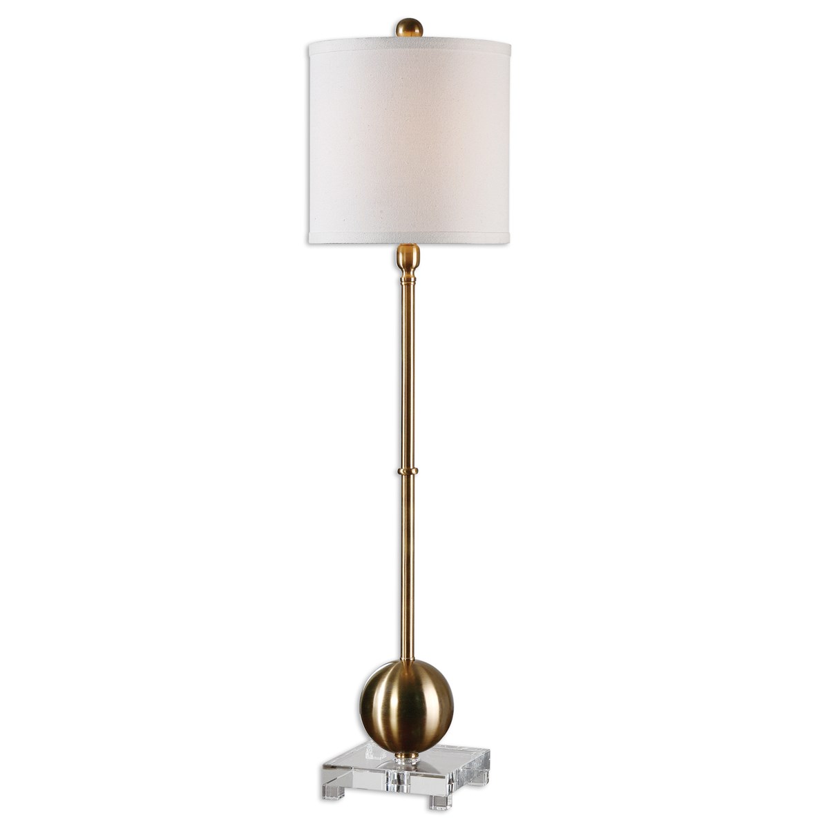 Brushed Brass Plated Metal Accented With A Thick Crystal Foot. The Round Hardback Drum Shade Is Off-white Linen Fabric.