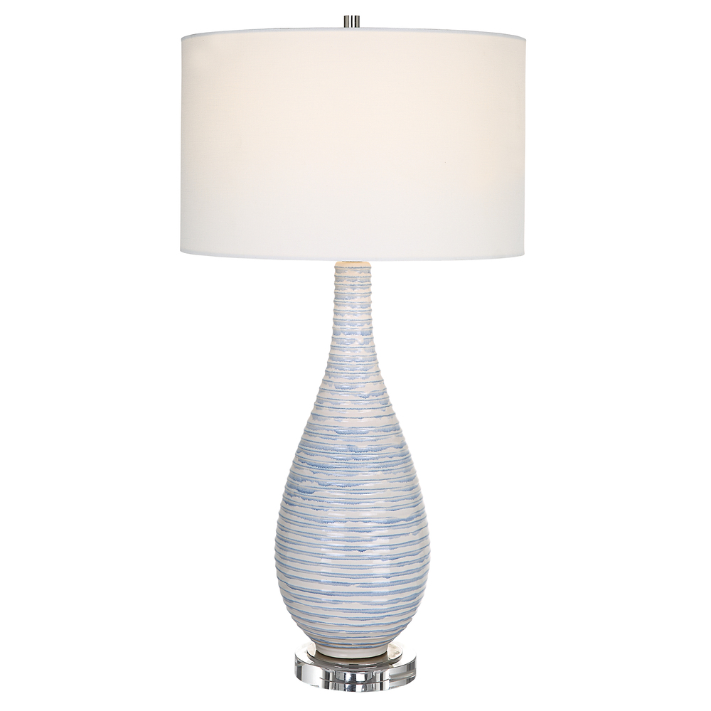 This Ceramic Table Lamp Features An Elegant Fluted Shape With Ribbed Texture Finished In A Soft Blue And White Drip Glaze. The Lamp Sits On A Thick Crystal Foot Paired With Polished Nickel Plated Details. A White Linen Drum Shade Compliments The Piece.