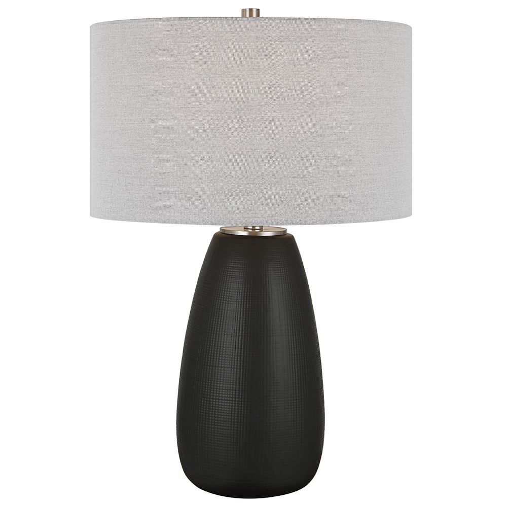 The twilight table lamp features a ceramic base with a subtle carved gridline texture, finished in a satin black glaze and accented by brushed nickel plated details. The hardback drum shade is covered in a light gray linen fabric.