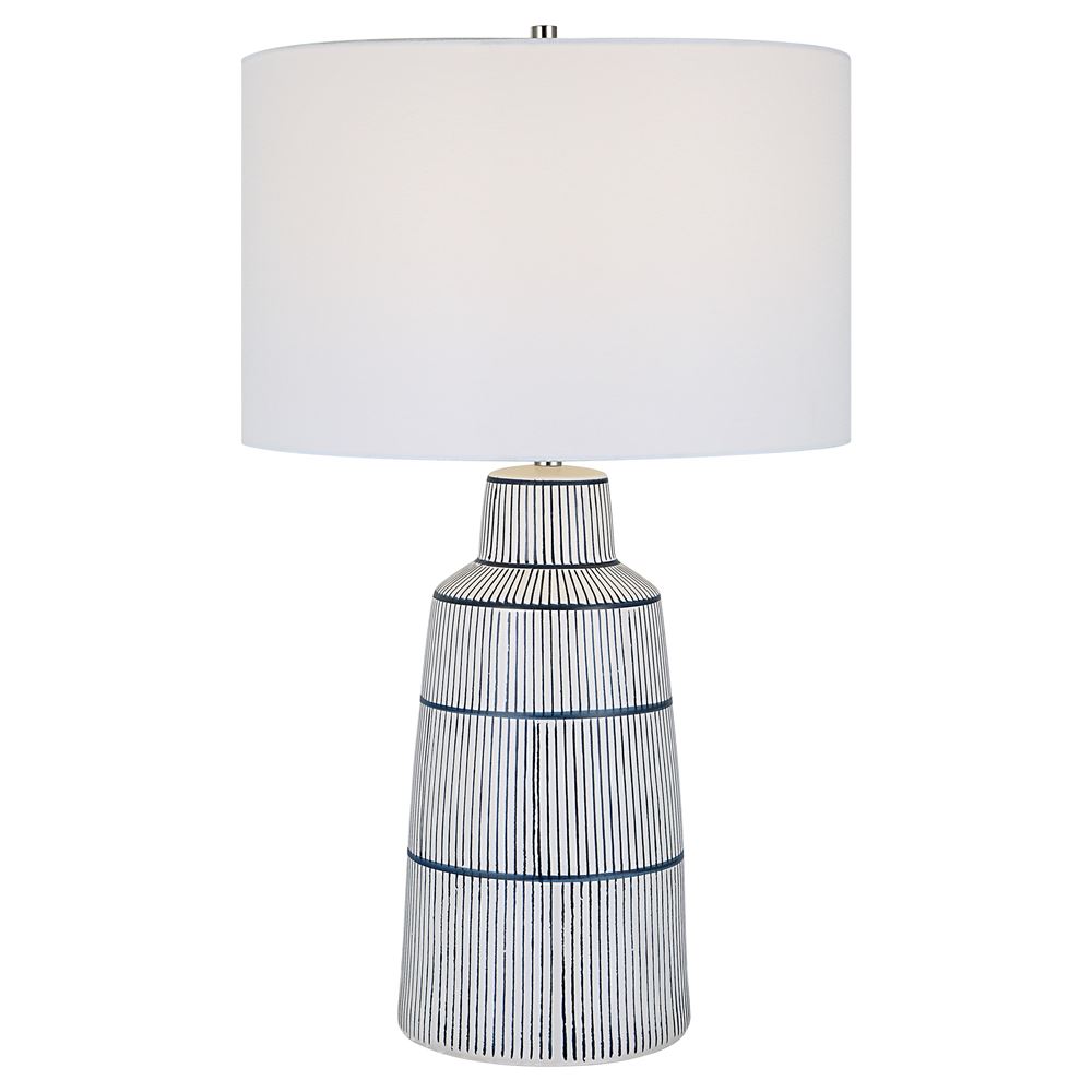 Inspired by the classic nautical stripe knit, this ceramic table lamp sports a satin white glaze with rich navy blue stripes and polished nickel plated accents. The hardback drum shade is covered in a crisp white linen fabric.