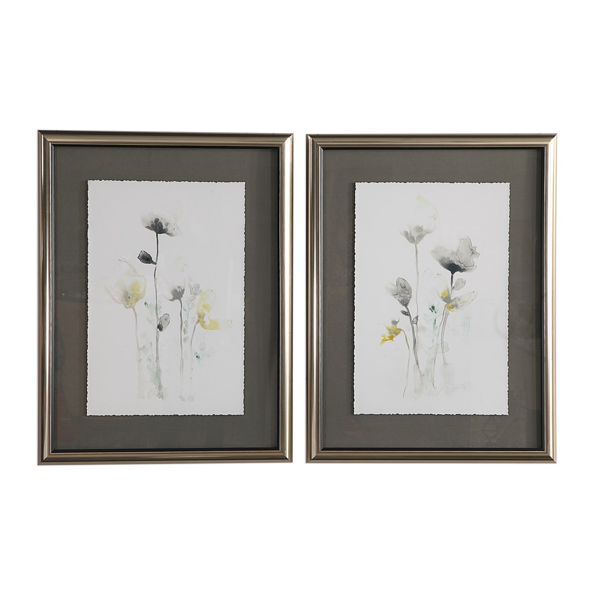 Traditional And Modern Styles Merge With These Floral Prints. Shades Of Forest Green, Yellow, And Gray Are Set On An Off-white Background With Deckled Edge Detailing. Each Print Floats Above A Dark Gray Mat. A Silver Leaf Frame With A Black Inner Lip Completes Each Piece Of Artwork. Each Print Is Placed Under Protective Glass.