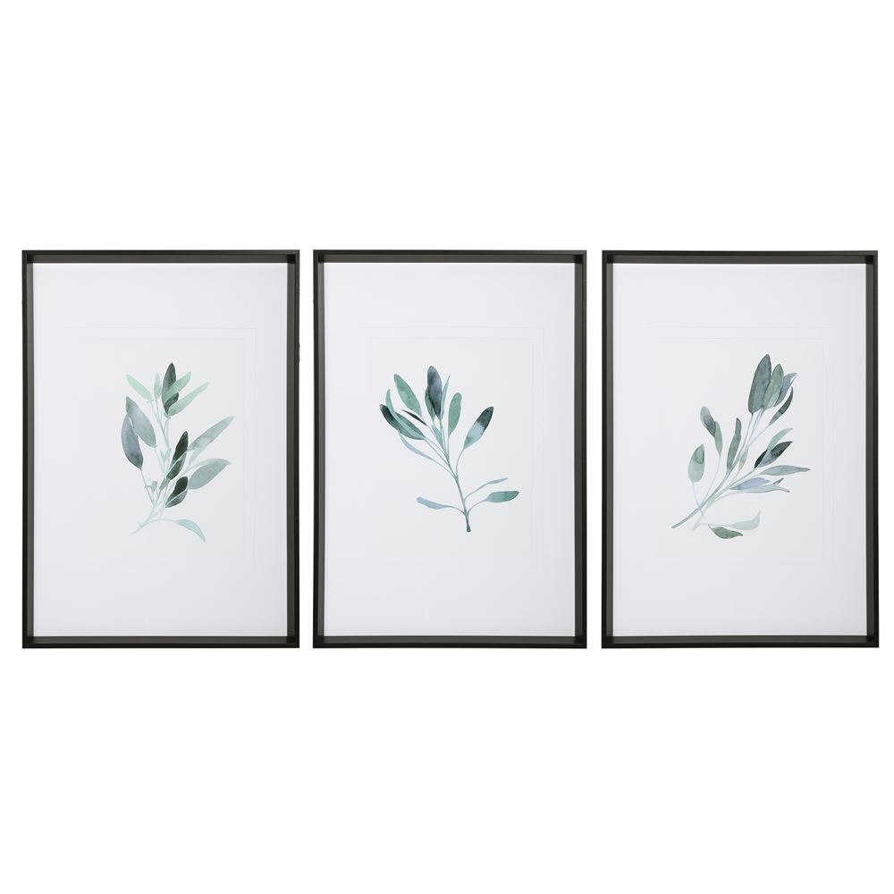 A Nod To Modern Farmhouse Style, This Set Of Artwork Showcases Individual Sage Branches Printed In A Watercolor Style. Cool Shades Of Green And Gray Blue Are Complemented By Elegant Double White Matting And A Petite Matte Black Frame, Under Glass. Artwork By Emma Scarvey.