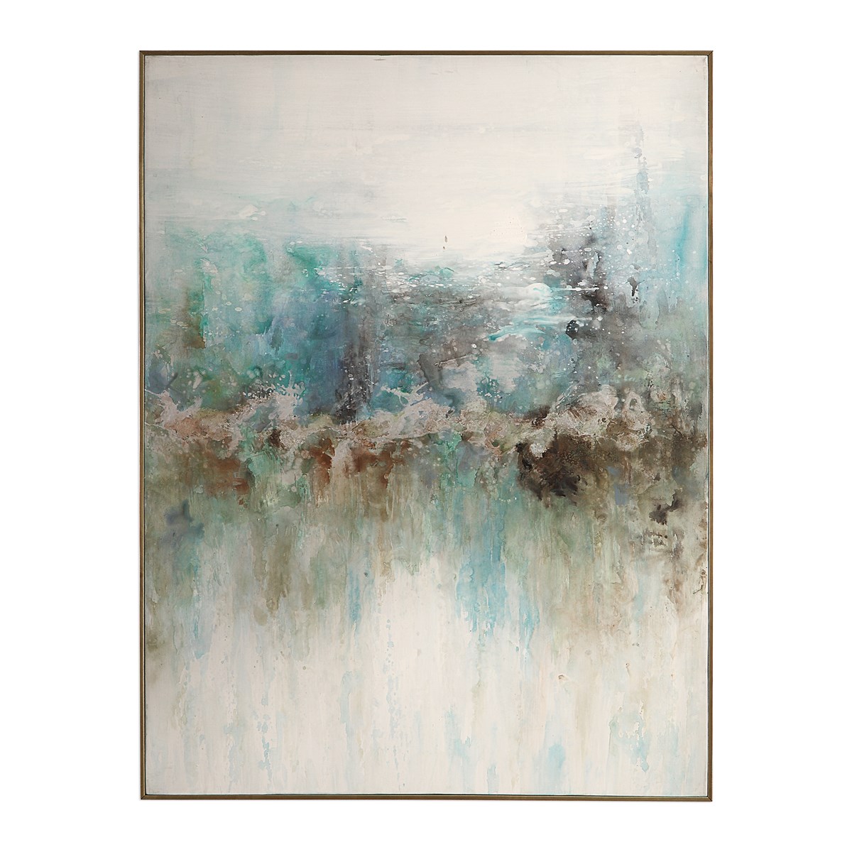 This Modern, Abstract Artwork Is Hand Painted On Canvas In On-trend Shades. Vibrant Navy, Cobalt, Teal, And Purple Hues Are Heavily Centered In The Piece With A Textured Finish. On Each Side, Lavender, Sea Foam, And Aqua Hues Are Accented By Gold And Brown Details. A Gold Gallery Frame With A Black Outer Edge Surrounds The Artwork. Due To The Handcrafted Nature Of This Artwork, Each Piece May Have Subtle Differences.