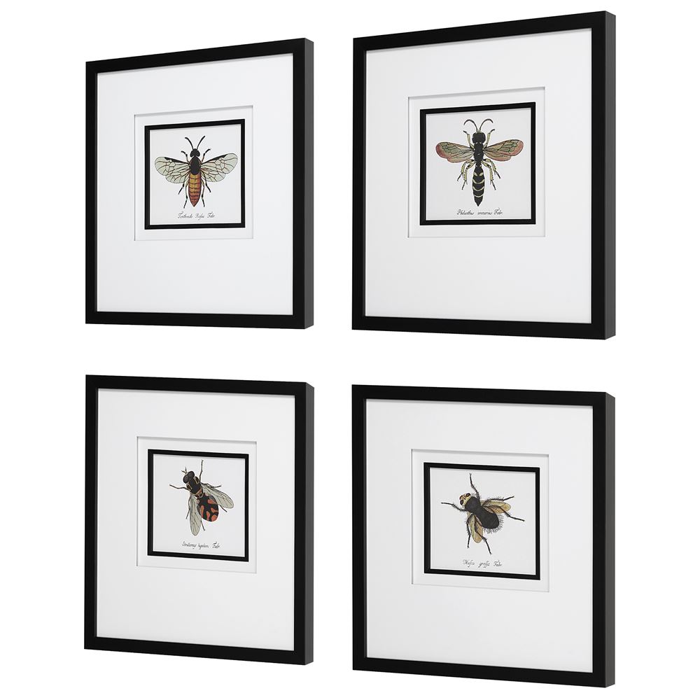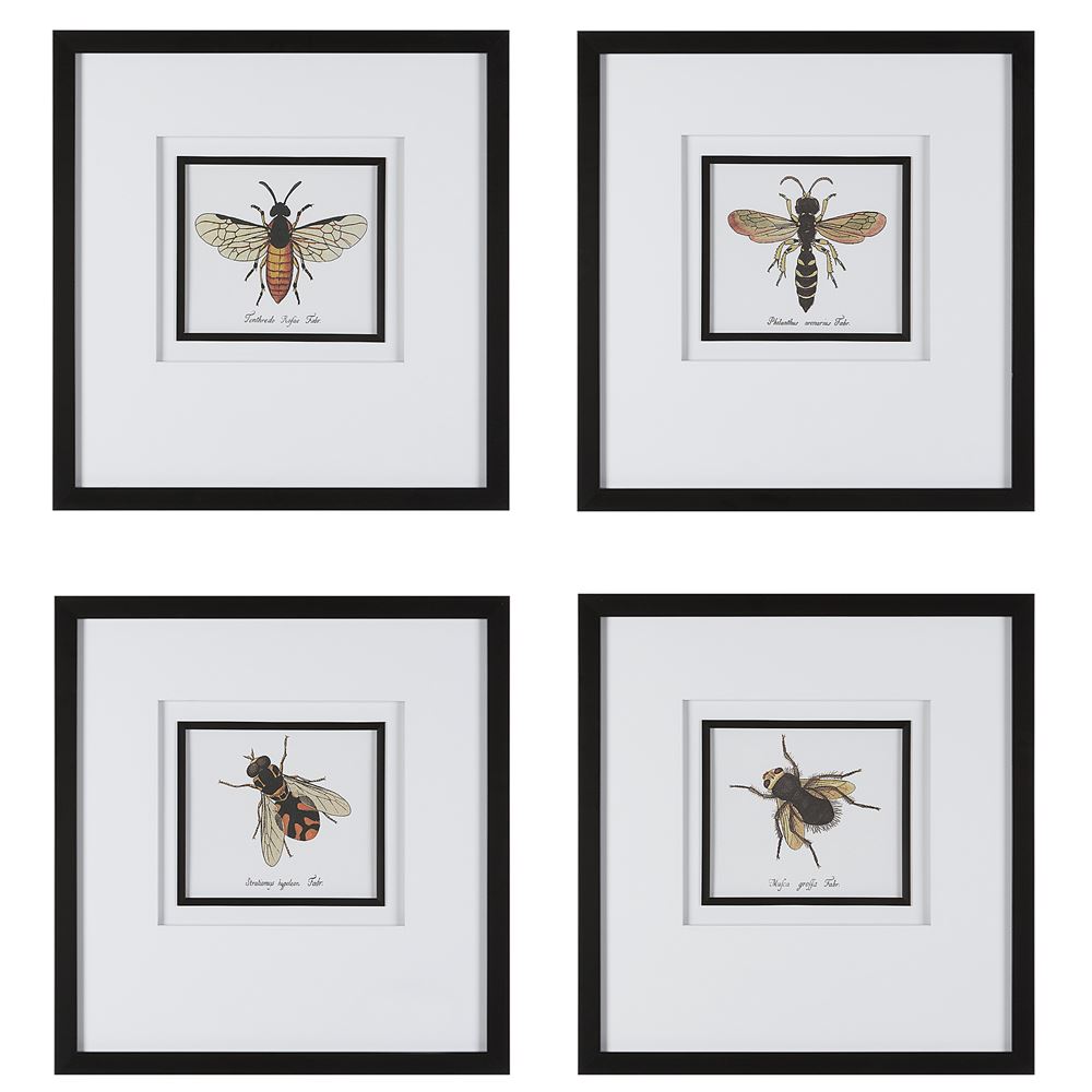 Inspired By Antique Scientific Bee Studies, This Artwork Exhibits Four Unique Species In Shades Of Black, Yellow, And Orange. Each Print Is Accented By Classic White Matting With A Slim Black Fillet And Matching Frame, All Under Glass.