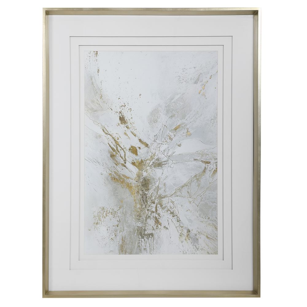 Create An Elegant Statement With This Feminine Abstract Print. The Neutral Artwork Features Shades Of Light Gray, White, And Gold Leaf. Triple White Matting And A Warm Silver Leaf Frame Complete This Sophisticated Piece. Print Is Placed Under Glass. Artwork By Jennifer Gardner.