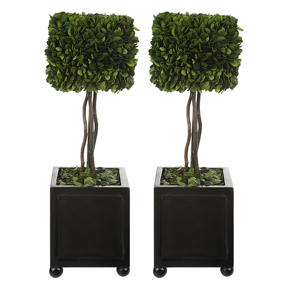 Natural Evergreen Foliage Preserved While Freshly Picked, Looks And Feels Like Living Boxwood. Supported By Natural Willow Branches, Two Square Topiaries Are Potted In Contemporary Ball Footed Planters Finished In Satin Black.