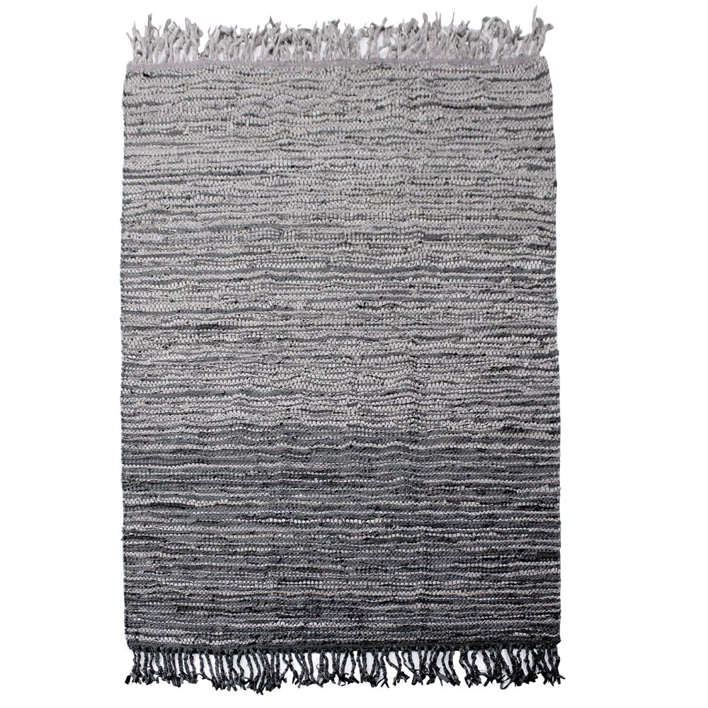 This hand woven rug features rescued leather in shades of taupe and rustic charcoal displaying an ombre effect.