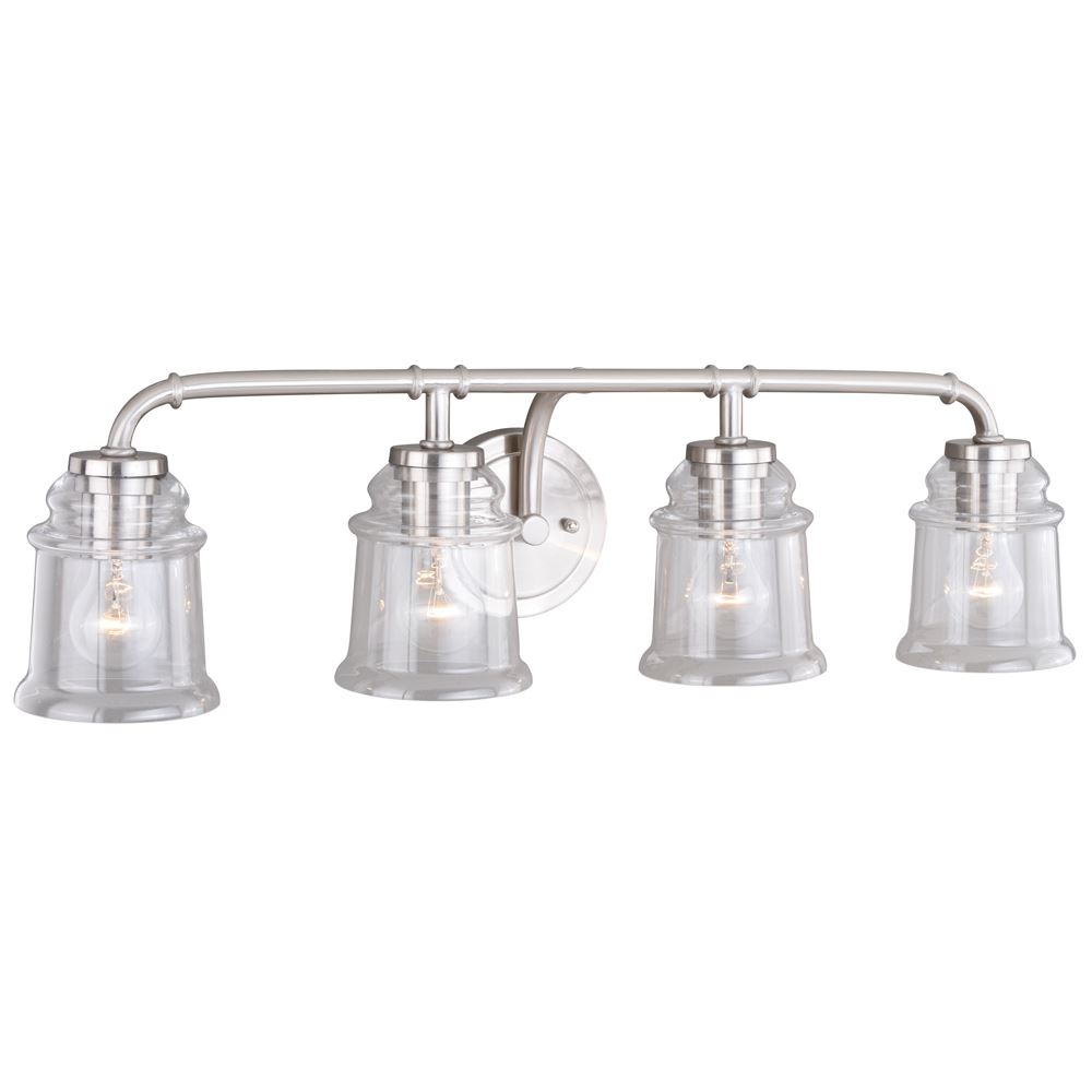 Clean retro lines define this beautiful vanity collection called Toledo. Notes of industrial and farmhouse tradition are defined by the sheen of satin nickel and elegance of clear blown glass. In addition to the vanity lights, the 5.25” mini pendant along with its 13” flush mount partner create the perfect combination of lighting for your bathroom. This collection is available in satin nickel and natural brass finishes.