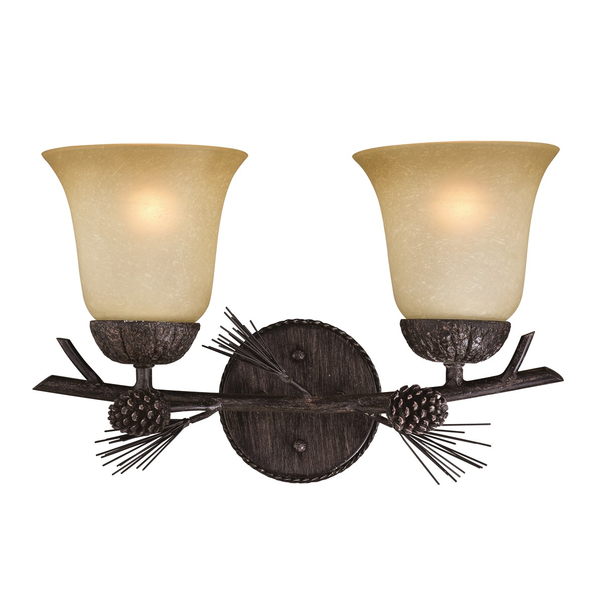The Sierra collection combines rustic and classic styling that brings nature indoors. Great for lodges, cabins, and nature-styled interiors, this fixture features black walnut finish and frosted scavo glass, with twisted wire rope and pine tree elements.