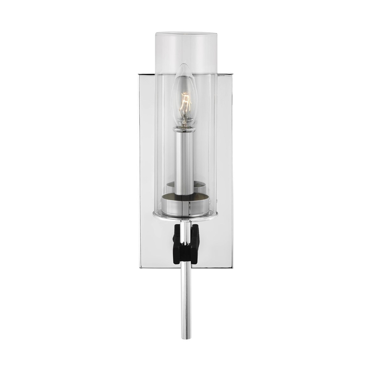 The Art-Deco-inspired Broderick features bold, angular lines in a rich, two-toned finish of shiny Chrome with Textured Black. Each of Broderick's clear glass shades rest atop a cylindrical bobeche, adding dimension to a smooth, structured silhouette.